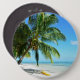 Button of a yellow kayak under a hanging palm tree on a white sand beach on the tropical island of Moorea, near Tahiti, in the Pacific archipelago French Polynesia.