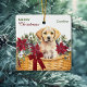 Here's a pretty Holiday ornament that would make a great gift for a grandchild, son, daughter, or anyone. Both sides of the ornament have an image of a basket of red poinsettia blossoms, white flowers, and pine bough sprigs. In the middle sits an adorable yellow Labrador Retriever puppy. The wicker basket is decorated with a red bow. The front has green and red text that says "Merry Christmas, and a name. The back has your signature and the year.