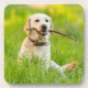 Horizontal image of a yellow labrador retriever dog sitting in grass with a stick in her mouth