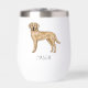 Destei's original cartoon illustration of a yellow colour Labrador Retriever breed dog. The dog has a kind face expression that is framed by her large floppy ears. The dog design pictures the dog from the side while standing. The dog's head is turned the viewer of the image. There is also a personalizable text area for a name or other custom text.