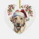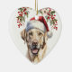On the front of this Holiday ornament is the image of a gorgeous yellow Labrador Retriever Dog. The dog wears a red and white Santa Claus hat, and a holly and red berry half wreath hangs above him. On the back is a repeat of the holly wreath, and red text that says MERRY CHRISTMAS". There are additional text fields for you to customise. Be sure to see other Lab dog images, as well as products, at Dog Village.