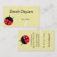 Promote any business in the child industry with this exclusive business card design featuring a yellow background, simple white swirls and adorned with a single ladybug. Customisable text allows you to alter fonts, change text colours and sizes to best reflect your business. Suitable for daycares, babysitting, schools, children's clothing and toy stores.