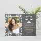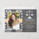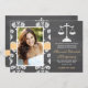 Add your photo or favourite picture to these rustic and pretty chalkboard style damask lace law school graduation announcements and invitations with a scales of justice in a chalk look artwork style and a printed YELLOW AND WHITE stitched ribbon look design. Customise it to say whatever you want on the back and front of the lawyer graduate graduation announcement and invite. Artwork © Chrissy H. Studios, LLC. All rights Reserved.