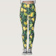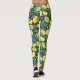 Leggings with a cute pattern featuring yellow lemons and green lime fruit with stalks of leaves set on a dark green background.