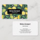 Business cards with a pretty pattern featuring yellow lemons and green lime fruit with stalks of leaves set on a dark green background.