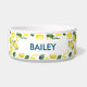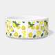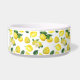 A pet bowl with a cute pattern of yellow lemons with green leaves and fresh cut lemon slices. A white rectangle layered over top with your text inside.
