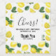 Event bottle labels with a cute pattern of yellow lemons with green leaves and fresh cut lemon slices. A white square layered over top with your text inside.