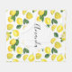 A blanket with a cute pattern of yellow lemons with green leaves and fresh cut lemon slices. A white circle layered over top with your text inside.