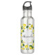 Water bottle with a cute pattern of yellow lemons with green leaves and fresh cut lemon slices. Personalise with a name inside a white circle.