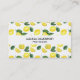 Business cards with a cute pattern of yellow lemons with green leaves and fresh cut lemon slices.