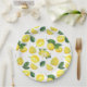 Paper plates with a cute pattern of yellow lemons with green leaves and fresh cut lemon slices.