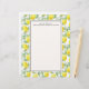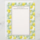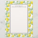 Letterhead designed with yellow lemons and green leaves, in a repeating pattern. Layered over top is a white frame for easy legible writing. Personalise with a name and address or other text.