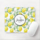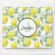 A mouse pad personalised with a monogram initial and name inside a white circle with a black border. Designed with yellow lemons and green leaves, in a repeating pattern.