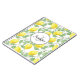 A spiral notebook personalised with a monogram initial and name inside a white circle with a black rope border. Designed with yellow lemons and green leaves, in a repeating pattern.