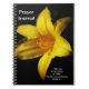 The front of this journal spiral notebook features my original photograph of a yellow Lily flower blooming in sunlight with a soft dark background. Bible Scripture from Psalm 5:1 is also on the journal.