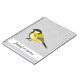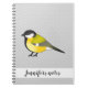 Destei's original cartoon illustration of an adorable Parus Major bird. The bird has a black head and the body is mostly yellow. The background colour is grey with a light pattern of polka dots. There is also a personalizable text area for the title of the notebook.