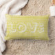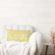 Subtle love words on a soft yellow ground make this a sweet pillow to brighten a room.