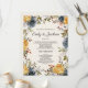 Elegant and rustic mustard yellow and navy blue handpainted watercolor floral wedding program with the ceremony schedule along with the listing of the bridal party.
