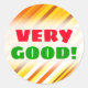 This sticker design features yellow, orange and white stripes inspired by the setting sun. It also features the encouraging saying "VERY GOOD!" in red and green coloured text. Stickers like these could perhaps be used by teachers, educators or tutors to acknowledge and motivate a student who has done very good work on a test, quiz, paper, project, or some other school or academic assignment. [~Z0000118]