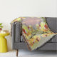 The beautiful pattern by HomeWare on this Throw Blanket was made from an original photograph of yellow orchids in the afternoon sunlight. The orchid flowers have pale yellow petals with red to purple centres. A dark green stem winds it's way up through the centre of the blooms. The pastel background is made up of shades of pink blending into pale green. A few light green leaves of an aloe plant can be seen in a corner. When the photo is combined to make the pattern, the floral design becomes a garden of orchids with the pink glow of the afternoon sun in the centre.