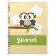 Personalise this cute and stylish custom owl spiral notebook cover with your name on the lime green contrast stitch ribbon design. An adorable wide eyed owl sits perched on a leafy branch against a fluffy cloud and yellow polk-a-dot sky background. This sweet and girly spiral bound notebook can be used as a journal or diary too, and it is equally great for home office or school supplies use. Artwork on this personalised and custom spiral journal is © Chrissy H. Studios, LLC. All Rights Reserved.