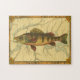 This print illustrates an artistic picture of a yellow perch fish. The background displays a vintage geographic map in light beige colours. The brown frame resembles old wood pattern with yellow-red flowers in the edges. A great addition to your fishing collection!