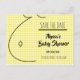 Sweet gender neutral baby shower save the date card! Design features a black outline drawing of a Mummy-to-Be with her baby bump. The background of the save the date announcement is yellow gingham plaid To the right of the baby bump is text in black font that says Save The Date with black line below it. There is customisable text where you can add the Mummy-to-be's name, the baby shower date and information about the invitations to come. This super cute save the date announcement for baby showers is perfect for the mummy to be that does not know the baby's gender or wishes to keep the shower gender neutral.