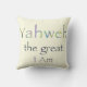 Yellow and purple dancing flames on lightning aqua blue background with multicoloured texture. This abstract art painting design is made up of many colors including yellow, aqua, blue, black and purple. This fire and textured color with swirling brush strokes was hand painted using digital art media which gives it a unique organic yet ethereal and energetic feel and ensures it will brighten anyones day. On the reverse side of this cushion is art typography incorporating the artwork on the front of the cushion. Word art ' Yahweh, The Great I Am' sits on a cream background that can be changed by hitting the customize button. Art typography and painting created by artist Catherine Sweetman