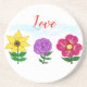 Love is written in red script against light blue cloudy sky. Yellow sunflower, purple flower, bright pink yellow flower with green leaves against a white background. Original Artwork by TamiraZDesigns.