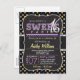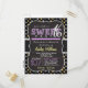 Cute Sweet 16, sixteen, invitation on yellow, black, and grey stars, starry night pattern with purple ric rac design elements. 16th, Sixteenth birthday party invite for girls. Vintage feel girly purple and yellow chalk fonts on cool blackboard background.