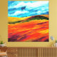 Colourful abstract landscape of hills and sky in colours of yellow, red, green, and blue.