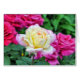A yellow rose sits among red blossoms. Note that this card may be customised with your own personal inscription.