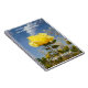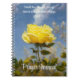 The front of this journal spiral notebook features my original photograph of a yellow rose flower in a garden. The image was processed in an illustrative and watercolor painterly style with a touch of whimsy in the artwork. Bible Scripture from Job 8:19 is at the top of the image and at the bottom are the words "Prayer Journal".