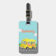 A cute kids luggage tag with the illustration of a yellow school bus with happy kids who are excited to go to school! Background of blue sky and white clouds. Personalise with the name of child to make a cute decorative piece for the little one's school bag.