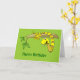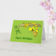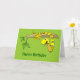 This reptile birthday card has a cute cartoon smiling snake image. It's yellow and brown and curled in a tree branch, with its head hanging down and its fangs out.