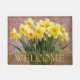 This 18" x 24" welcome mat features a lovely photo of yellow spring daffodils in full bloom with a rustic lavender background and the text "Welcome" below. Designed just for you by world renowned artist ©Tim Coffey.