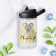 The product design features a baby koala surrounded by flowers. The adorable Australian animal cartoon with yellow stripes makes a cute and unique water bottle with personalised text.
