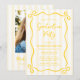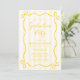 A trendy yellow graduation party invitation template, featuring a whimsical doodle bow frame and stripes. Easily add a photo to the back of the invitation. A fun design for a girl grad party!