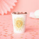 Are you planning a sun-themed girl's birthday party? These cute paper cups are decorated with a yellow watercolor smiling sun. Original Watercolor © Michele Davies.
