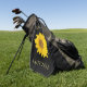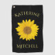A close-up photograph of a single bright yellow sunflower and templates for first and last name on black background.
