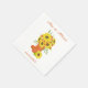 A lovely sunflower wedding themed napkin, this item features name of the couple at the top in orange cursive font. Underneath is a sunflower graphic with the wedding date. Order yours today!
