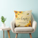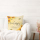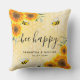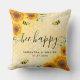 A pillow as a wedding gift or keepsake. A golden background with a bee honeycomb pattern and happy smiling bumble bees. Decorated with yellow and orange sunflowers, florals and greenery. Personalise and the names of the couple. black letters. The text: bee happy written with a modern, large hand lettered style script with swashes.
