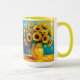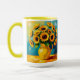 A beautiful personalised coffee mug with a gorgeous illustration of a yellow sunflowers in a pretty yellow vase done in an impasto style.