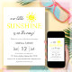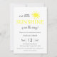 Simple and modern summer baby shower invitation featuring a cute sun on a clean white background. With the words " our little sunshine is on the way " and stripe pastel yellow and white reverse. Ready for easy personalisation.