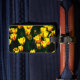 Tulip flowers of yellow and red colour on a flowerbed. Play of sunlight and dark green background. Tulips look like burning candles. Yellow tulip stands for hope, cheerfulness and bright and enigmatic smile.