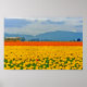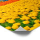 Photo of a field of yellow and orange tulips with an orange childrens' school bus parked at the end of the fields of flowers and the mountains in the distance. This picture of tulips was taken at the Skagit Valley Tulip Festival in Washington state, USA. The colourful tulip beds stretch out almost as far as the eye can see. You can have this picture of tulips printed on many different customisable products.