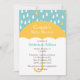 Traditional looking baby shower invitation done in white, with a large yellow umbrella, covering the text area. Graphics of a aqua, with white and yellow raindrop pattern decorates the top of the invitation. Personalise all the text to suit your event needs.