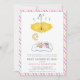 Yellow umbrella and sleeping baby girl shower by mail invitation, featuring a sleeping baby girl on a cloud, a crescent moon and a star over it and a yellow umbrella with water drops. Around it there is a border with pink and yellow diagonal stripes and the same stripes cover the back. Some elements by Trina Clark and courtesy of vectorportal.com.