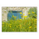 Yellow watercolor flowers in blossom with blue wooden door and stone wall