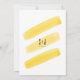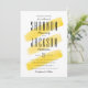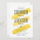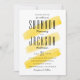 A modern wedding invitation features yellow watercolor stripes background.